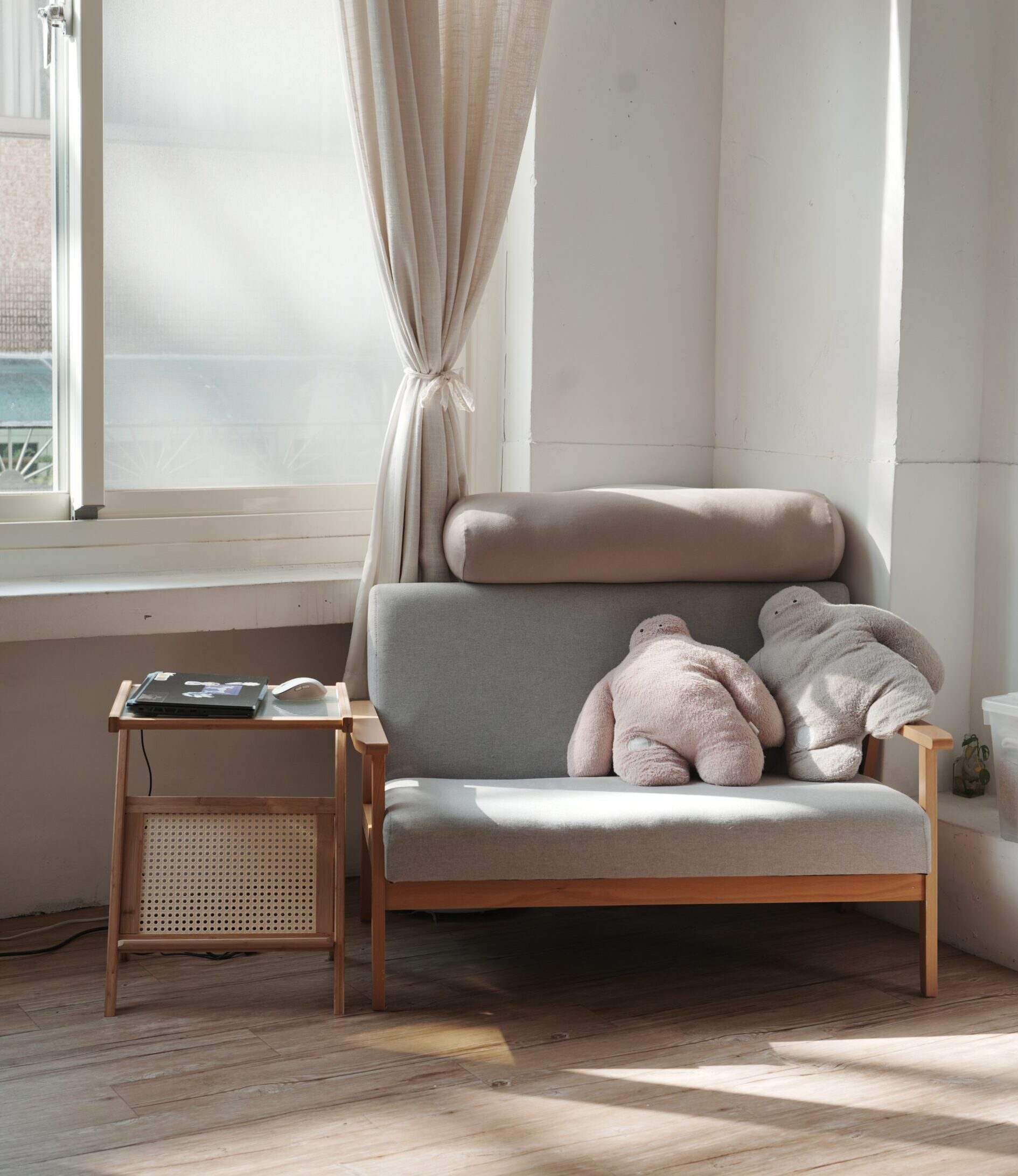 陽光灑落灰色牆面,透亮而溫柔木質家具與綠植相映,就像來到森林中的小木屋