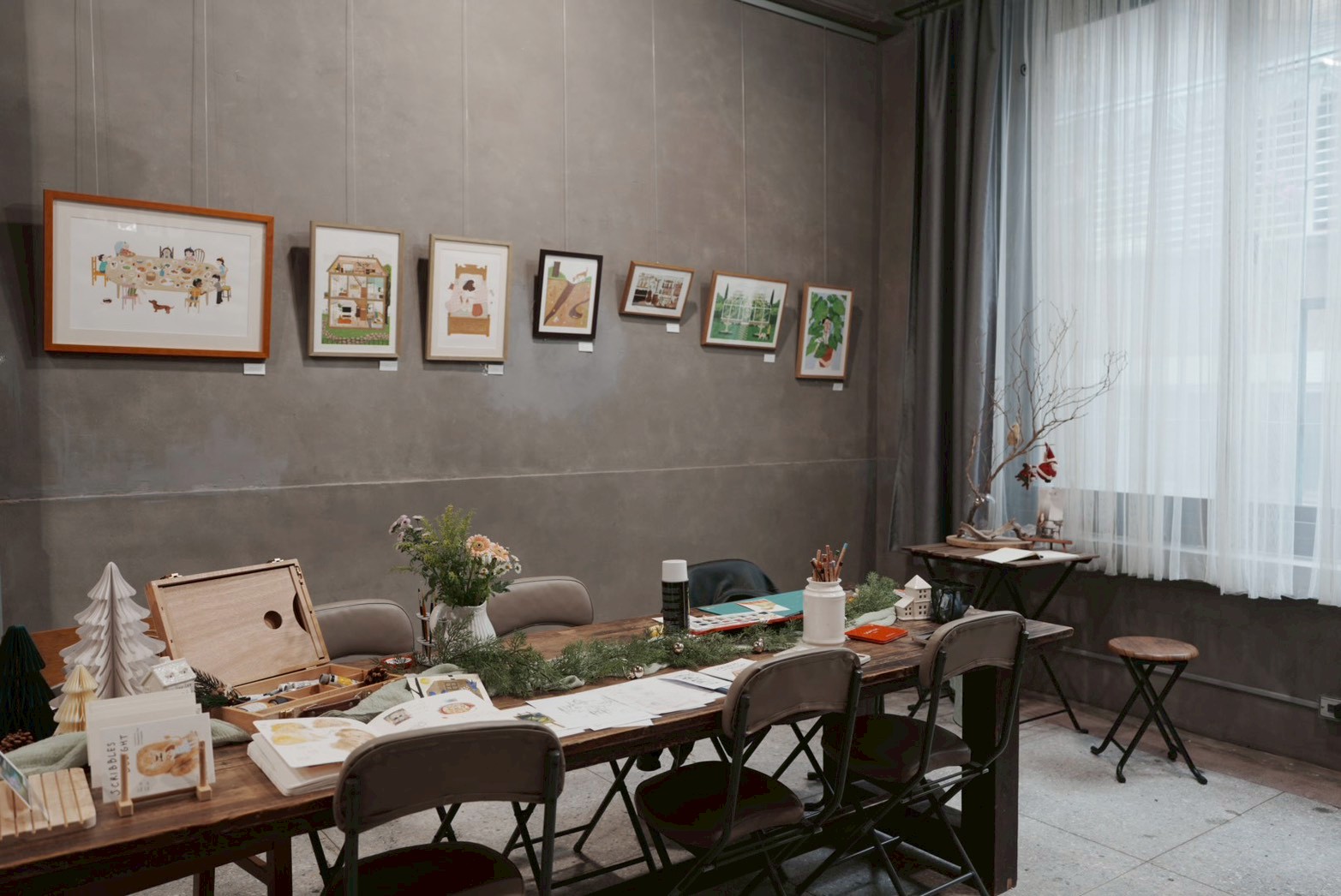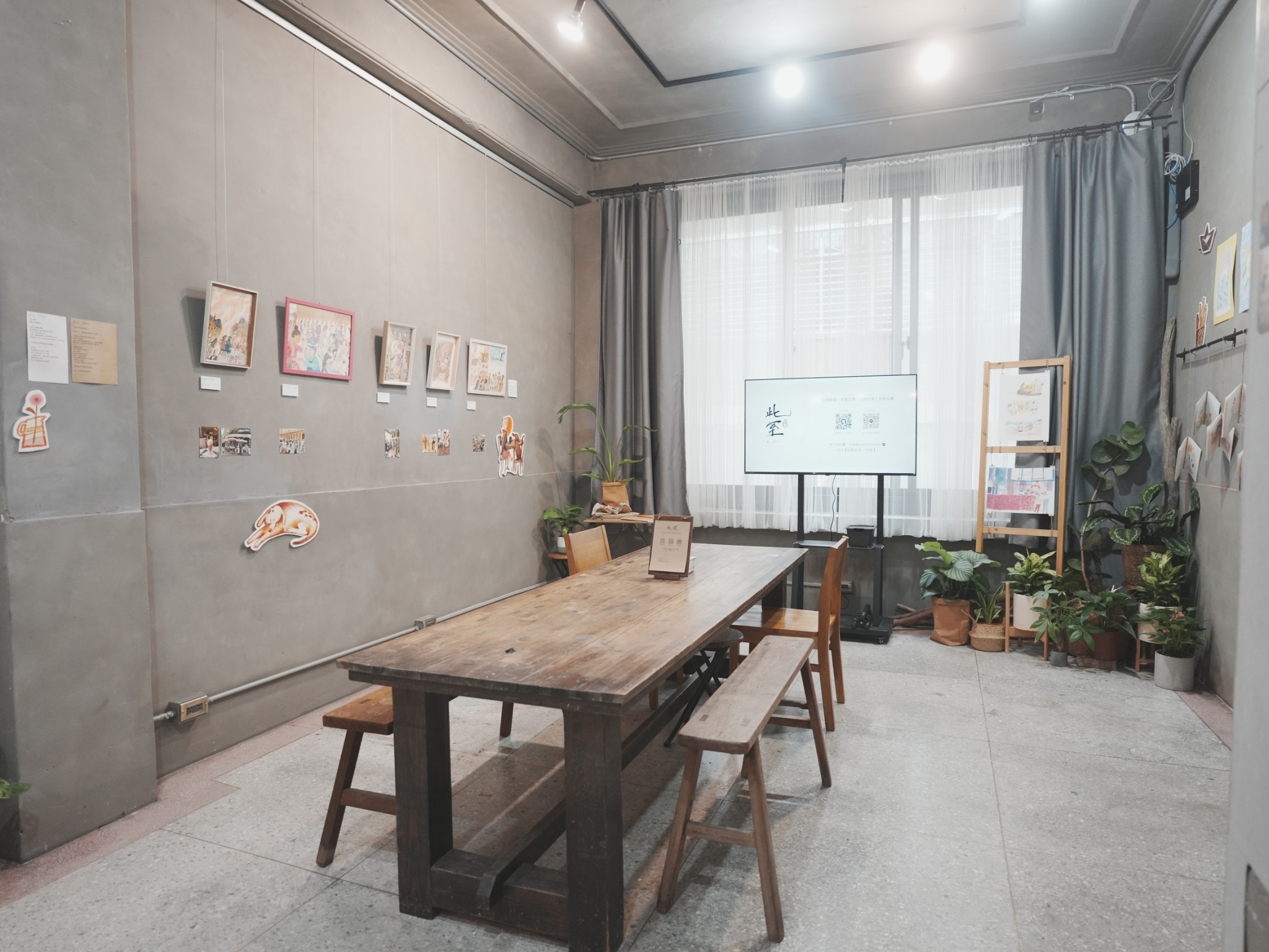 此室的光線美到讓人想慢下來🫧空間裡有香香的草本味,挑高設計讓畫作能懸掛得很有層次!大桌子跟大螢幕都超實用,不管展覽或工作坊都很剛好。幸運的話還能遇到可愛貓貓陪你一起看展!